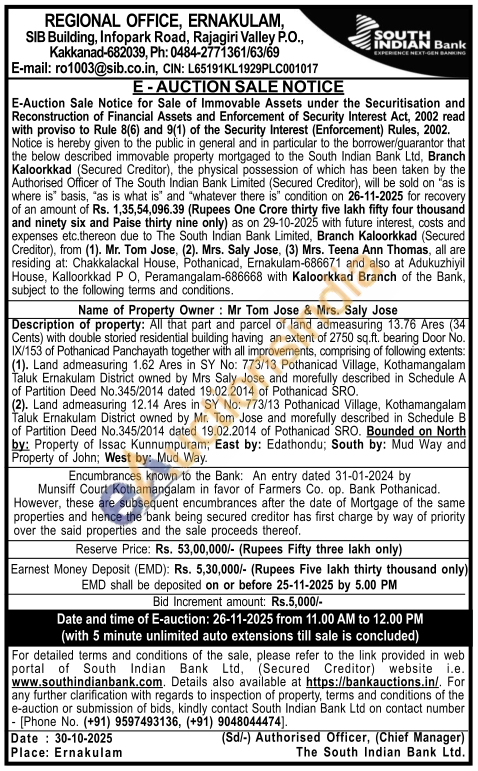 Cents) with double storied residential building having an extent of 2750 sq.ft. bearing Door No. IX/153 of Pothanicad Panchayath together with all improvements, comprising of following extents: (1). Land admeasuring 1.62 Ares in SY No: 773/13 Pothanicad Village, Kothamangalam Taluk Ernakulam District owned by Mrs Saly Jose and morefully described in Schedule A of Partition Deed No.345/2014 dated 19.02.2014 of Pothanicad SRO. (2). Land admeasuring 12.14 Ares in SY No: 773/13 Pothanicad Village, Kothamangalam Taluk Ernakulam District owned by Mr. Tom Jose and morefully described in Schedule B of Partition Deed No.345/2014 dated 19.02.2014 of Pothanicad SRO. Bounded on North by: Property of Issac Kunnumpuram; East by: Edathondu; South by: Mud Way and Property of John; West by: Mud Way
