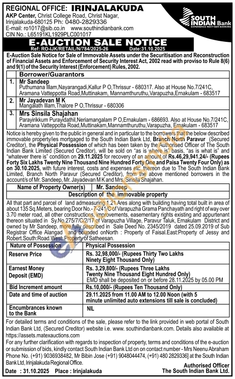 All that part and parcel of land admeasuring 1.21 Ares along with building having total built in area of about 135 Sq.Meters, bearing Door No.-7-241/C of Varapuzha Grama Panchayath and right of way over 3.70 meter road, all other constructions, improvements, easementary rights existing and appurtenant thereon situated in Sy.No.275/7/C/2/17 of Varapuzha Village, Paravur Taluk, Ernakulam District and owned by Mr Sandeep, more fully described in Sale Deed No. 2345/2019 dated 25.09.2019 of Sub Registrar Office Alangad and bounded onNorth Property of Faisal. East:Property of Jessy and Robert. South Road. West: Property of Satheesan