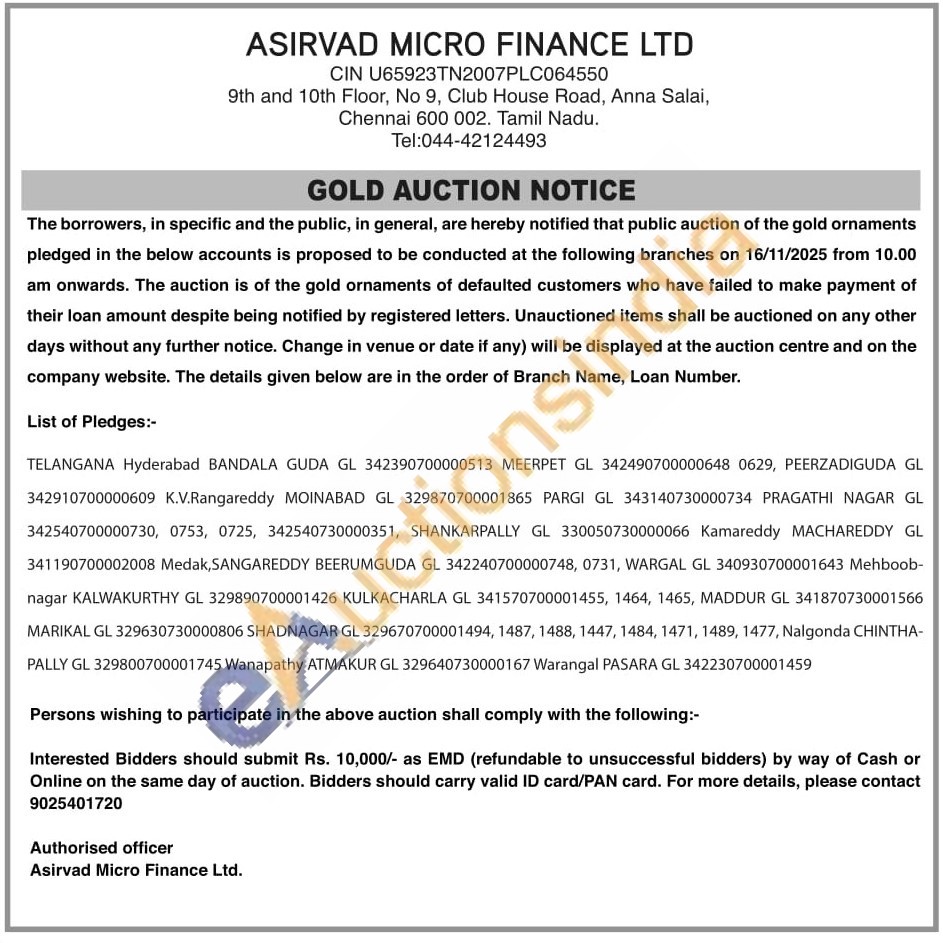 Asirvad Micro Finance Ltd Gold Auctions Auction in Hyderabad