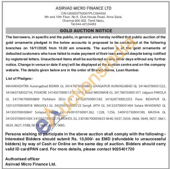 Asirvad Micro Finance Ltd Gold Auctions Auction in Aurangabad