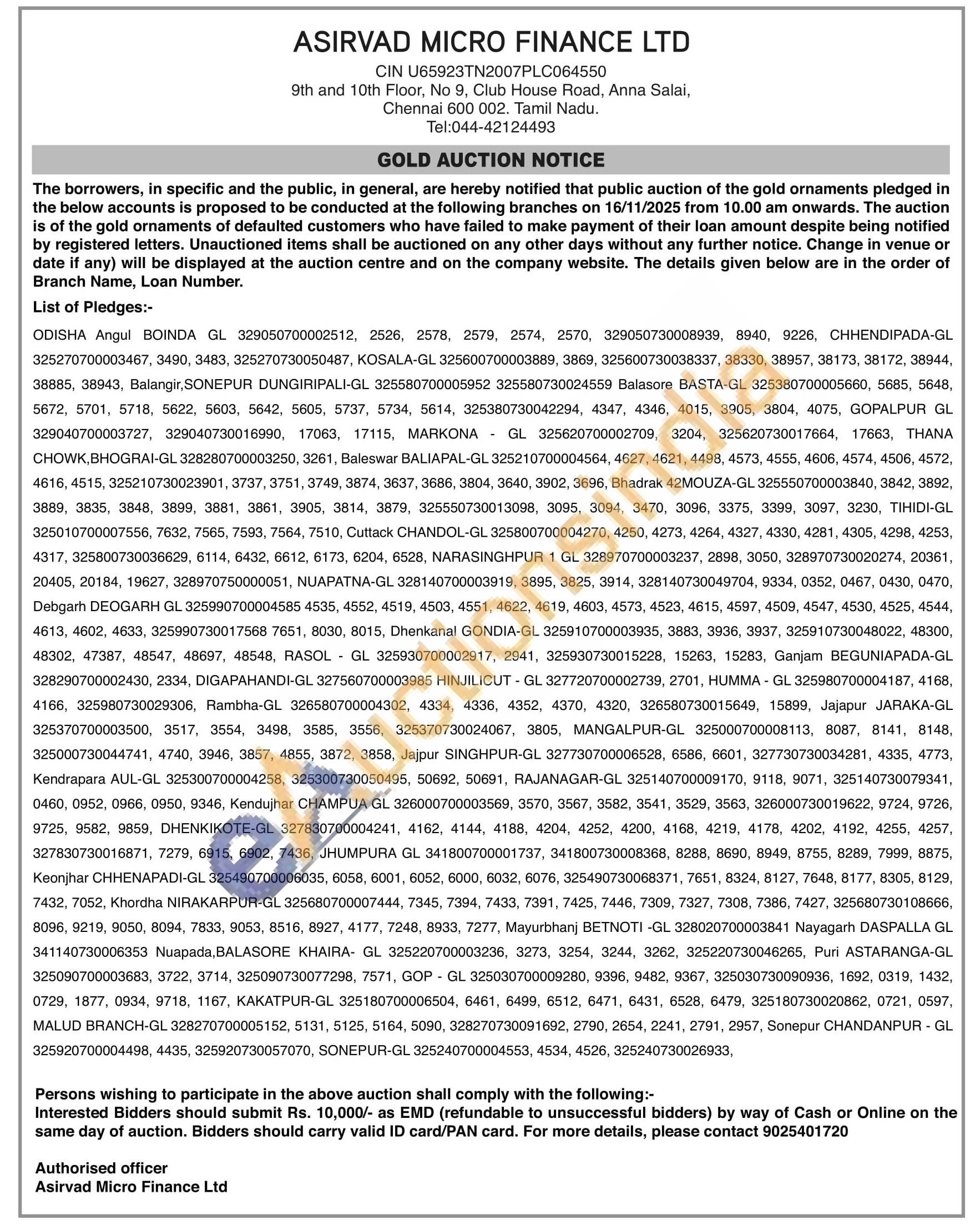 Asirvad Micro Finance Ltd Gold Auctions Auction in Angul