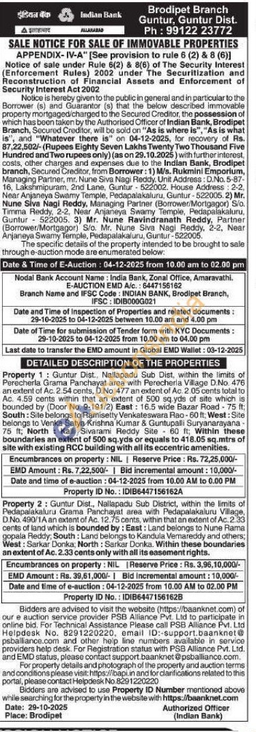 Property 2: Guntur Dist., Nallapadu Sub District, within the limits of Pedapalakaluru Grama Panchayat area with Pedapalakaluru Village, D.No. 490/1A an extent of Ac. 12.75 cents, within that an extent of Ac. 2.33 cents of land which is bounded by: East: Land belongs to Nune Rama gopala Reddy, South: Land belongs to Kandula Vemareddy and others; West: Sarkar Donka: North: Sarkar Donka. Within these boundaries an extent of Ac. 2.33 cents only with all its easement rights.