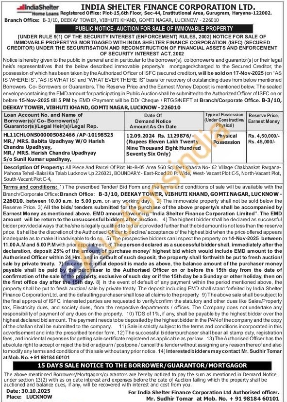 Description Of Property: All Piece And Parcel Of Plot No-B-05 Area 560 Sq. feet Khasra No- 62 Village Chakbankat Pargana-Mahona Tehsil-Baksi Ka Talab Lucknow Up 226021, BOUNDARY-East-Road 20 Ft Wide, West-Vacant Plot C-5, North-Vacant Plot, South-Vacant Plot C-4,