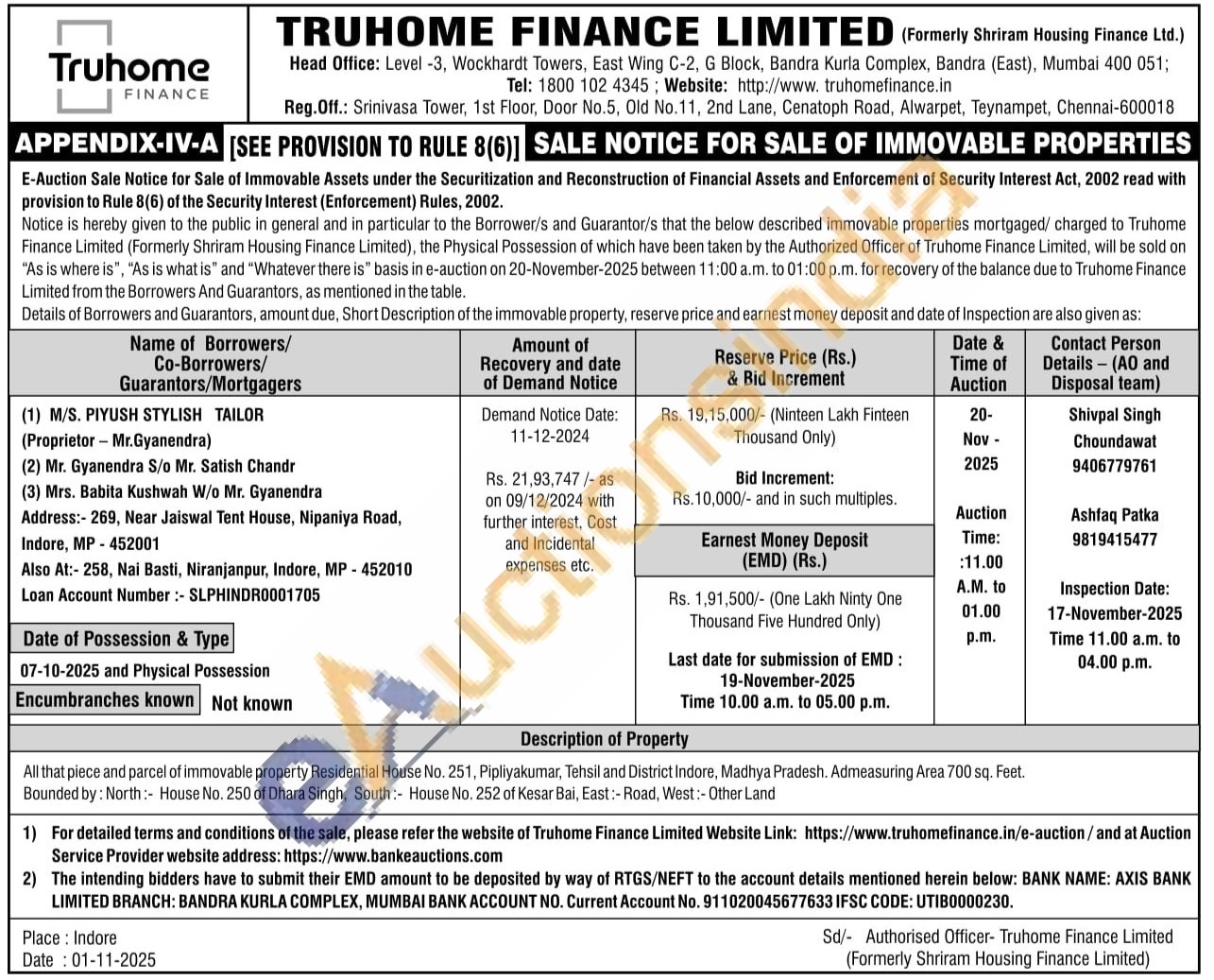 All that piece and parcel of immovable property Residential House No. 251, Pipliyakumar, Tehsil and District Indore, Madhya Pradesh. Admeasuring Area 700 sq. Feet. Bounded by: North: House No. 250 of Dhara Singh, South: House No. 252 of Kesar Bai, East:- Road, West:- Other Land