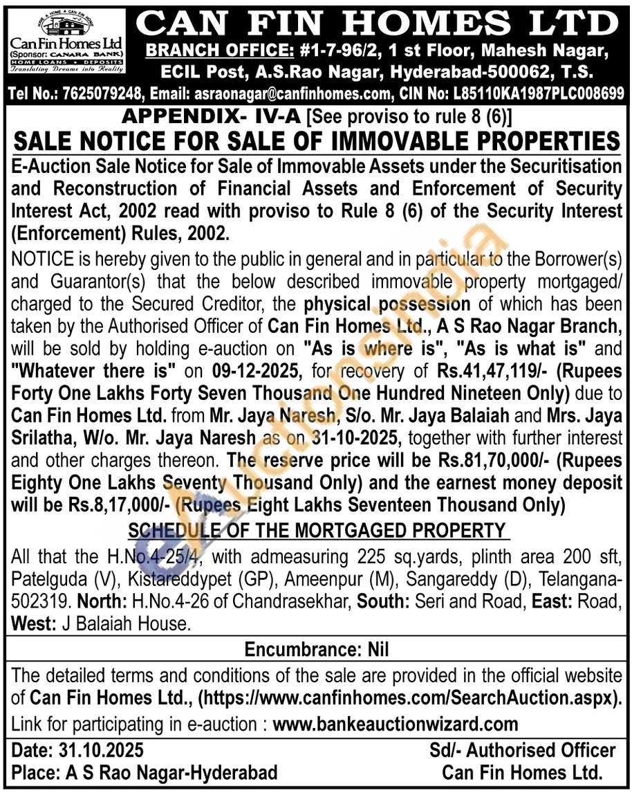 All that the H.No.4-25/4, with admeasuring 225 sq.yards, plinth area 200 sft, Patelguda (V), Kistareddypet (GP), Ameenpur (M), Sangareddy (D), Telangana-502319. North: H.No.4-26 of Chandrasekhar, South: Seri and Road, East: Road, West: J Balaiah House
