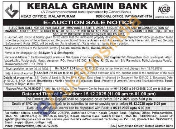 Details of property/les: 3.11 Cents of Land in Sy No.49 in Kodam East village in obtained by Document No. 1251/2015, Document Date 24-06-2015 SRO Kollam Boundaries: North: Property of Vasudevan, East: Property of Lekshmi Amma And Thankachi Amma, South: Property of Rajan, West: Way