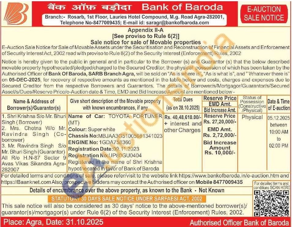 Name of Car: TOYOTA FORTUNER (MT) Colour: Super white Chassis No: MBJAA3G51005981341023 ENGINE No: 1GDA758360 Registration Date: 09.11.2023 Registration No: UP80GU0404 Registered in the name of Shri Krishna hypothecated in favor of Bank of Baroda