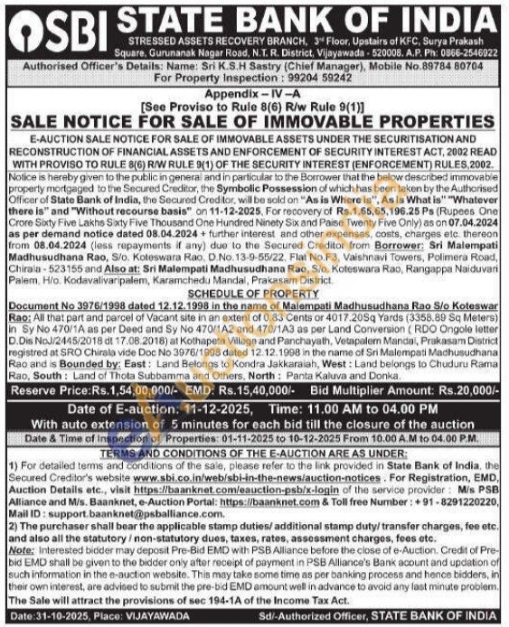 Document No 3976/1998 dated 12.12.1998 in the name of Malempati Madhusudhana Rao S/o Koteswar Rao: All that part and parcel of Vacant site in an extent of 0.83 Cents or 4017.20Sq Yards (3358.89 Sq Meters) in Sy No 470/1A as per Deed and Sy No 470/1A2 and 470/1A3 as per Land Conversion (RDO Ongole letter D.Dis NoJ/2445/2018 dt 17.08.2018) at Kothapeta Village and Panchayath, Vetapalern Mandal, Prakasam District registred at SRO Chirala vide Doc No 3976/1998 dated 12.12.1998 in the name of Sri Malempati Madhusudhana Rao and is Bounded by: East: Land Belongs to Kondra Jakkarasah, West: Land belongs to Chuduru Rama Rao, South: Land of Thota Subbamma and Others, North: Panta Kaluva and Donka