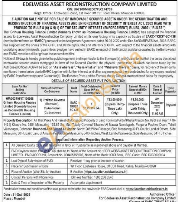 Property Description: All That Piece And Parcel of Mortgaged Property of Land Forming Part of Khata Khatoni No. 09 (Fasli Year 1416-1421) Khasra No. 3654 Measuring 179.65 Sq. Mts. Totally Covered Situated At Mauza Nawabgarh, Pargana Pachwa Doon, Tehsil Vikasnagar, Dehradun Bounded And Butted As Under: North: 20ft Wide Passage, Side Measuring 30 Ft, South: Land of Others, Side Measuring 30 Ft. East: Land of Amasta Peetar, Side Measuring 64ft 4 Inches, West: Land of Sanjeeda, Side Measuring 64 Ft 6 Inches