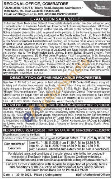 Item No. 2: All that part and parcel of land admeasuring 6.76 Ares along with al other improvements, usufructis, mamool rights of way and all other easmentary rights thereon in Survey No. 136/2-1, Re-Sy. No. 169/29 in Karumkulam Village, Neyyattınkara Taluk, Kanjiramkulam Sub Registration District, Thiruvananthapuram District owned by Legal Heirs of Late Michael Dasan and more fully described in Sale Deed No. 704/96 dated 24.07.1996 of Kanjiramkulam SRO and BOUNDED as follows. North Property of Soman, East: Property of Soman and Sheela, South Road, West: Property of Sindhu