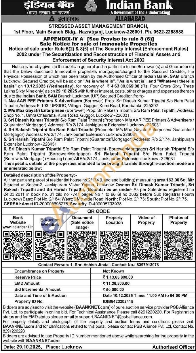 All that part and parcel of residential house no.2/174 (Land and building) measuring area 162.00 Sq. Mtr Situated at Sector-2, Jankipuram Vistar Yojana, Lucknow Owner: Sri Dinesh Kumar Tripathi, Sri Rakesh Tripathi and Sri Harish Tripathi, (Boundaries as under-As per Sale deed registered on 24.03.2011 in book no. 01 zild no 7741 pages No 1 to 96 Si no 3032 before Sub Registrar Fourth Lucknow) East: Plot No. 2/184; West: 9 Mtr wide Road, North: Plot No. 2/173; South: Plot No. 2/175. CERSAI: Asset ID-200005696275, Security ID-400005703938