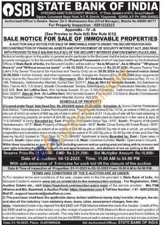 SCHEDULE OF PROPERTY (Covered under Regd. Sale Deed Doc. No.293/2020 dated: 03.02.2020): Schedule-A: Guntur District, Pedakakani Sub District, Thakkellapadu Grama Panchayathi area, Thakellapadu Grama D.No. 141/A, an extent of 980 sq yds of site out of which an extent of 846 sq.yds of site in which, an extent of 21.14 sq.yds of site left for road widening in which remaining property an extent of 824.86 sq.yds of site and constructed an Apartment in the name & style of "V.S.GRAND" is being Bounded by: East :Property of Moparthi Satya Teja-81'6", South: Property of Moparthi Venkateswarlu-87'3", West: Property of Moparthi Brahmaiah-900", North: Circar Donka (60 ft wide Road)-85'8". Within these boundaries an extent of an extent of 824.86 sq yds or 689.66 Sq.mts of site in which, an undivided, unspecified and indivisible share of site measuring an extent of 41.243 Sq. yds or 34.48 Sq.mts of site and One Flat bearing No.403 located in Third Floor of ""V.S.GRAND" Apartment is being Bounded by: East: Open area in Ground, South: Open area in Ground and Common Lift, West: Common Corridor, North: Open area in Ground. Within these boundaries an area of 1000 Sq.ft (including common and car parking area) and along with its common and joint rights including the rights of easements and appurtenances etc., and allotment of one car parking in the stilt