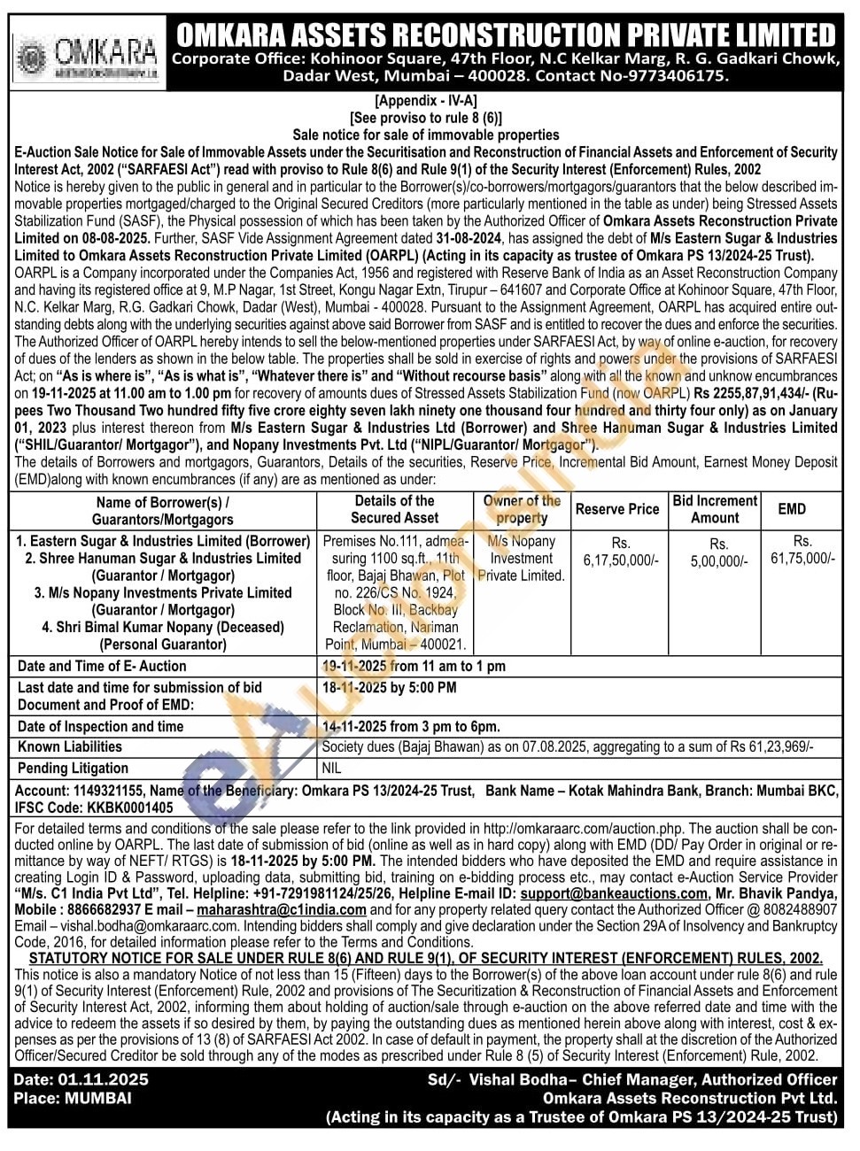 Premises No.111, admea-suring 1100 sq.ft., 11th floor, Bajaj Bhawan, Plot no. 226/CS No. 1924, Block No. III, Backbay Reclamation, Nariman Point, Mumbai-400021