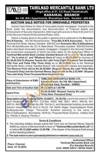 Description of the Property (GPS: 10.95677, 79.78116): Land to the extent of 1818 Sqft situated at R.S.No.14/7, O.S.Nos. 462/2, 468, 462/1, 464/1, 465/18, 451, 465/1A, 465/2, 464/2, Patta No.286 Plot No.2, and Residential buliding constructed thereon measuring 829 Sq.ft in No.22. Om Sakthi Nagar, Sayampalayam Road. Subbayapuram Village, Thirunallar. Karaikal standing in the name of Mrs.S.Sathyabama. Boundaries: North by: Proposed Road, South by Voikkal, East by Plot No 3, West by: Plot No. 1.