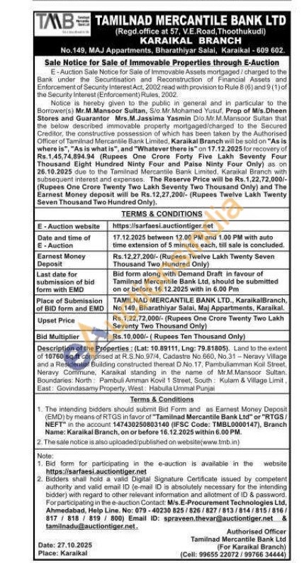 Description of the Properties: (Lat: 10.89111, Lng: 79.81805). Land to the extent of 10760 sq.ft comprised at R.S.No. 97/4, Cadastre No 660, No.31-Neravy Village and a Residential Building constructed thereat D.No.17, Pambuliamman Koil Street, Neravy Commune, Karaikal standing in the name of Mr.M.Mansoor Sultan. Boundaries: North Pambuli Amman Kovil 1 Street, South Kulam & Village Limit, East: Govindasamy Property, West: Habulla Ummal Punjal