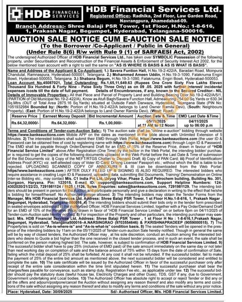 Details of Immovable Properties:- All that Piece and Parcel of Property Land and Building Bearing Door No. 19-2-422/A/5/1, (PARTION of Old Municipal No. 19-2-422/A), Know as Atufi Bagh/Savera Function Hall, Admeasuring 754.00 Sq. Yards or 630.34 Sq.Mtrs (OUT of Total Area 2875.16 Sq. Yards) situated at Outside Fateh Darwaza, Hyderabad, Telangana State (PIN No: 1051932984 Bounded by: (North: Portion of H.No. 19-2-422/A belongs to Land Owner Ramila Devi), (South: Neighbours Property), (East: Portion of H.No. 19-2-422/A belongs to Land Owner Ramila Devi), (West: Road).