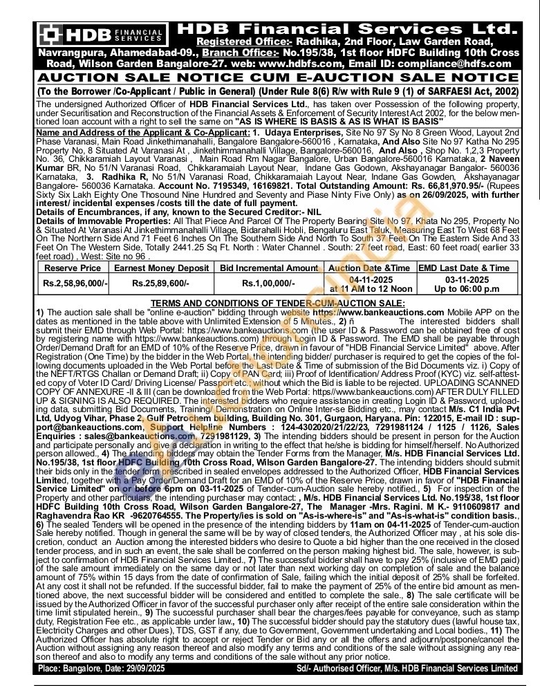 Details of Immovable Properties: All That Piece And Parcel Of The Property Bearing Site No 97, Khata No 295, Property No & Situated At Varanasi At Jinkethimmanahalli Village, Bidarahalli Hobli, Bengaluru East Taluk, Measuring East To West 68 Feet On The Northern Side And 71 Feet 6 Inches On The Southern Side And North To South 37 Feet On The Eastern Side And 33 Feet On The Western Side, Totally 2441.25 Sq Ft. North: Water Channel. South: 27 feet road, East: 60 feet road(earlier 33 feet road), West: Site no 96