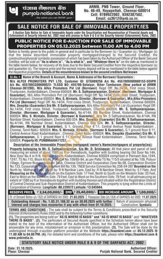 All that piece and parcel of land measuring an extent of about 1580 sq ft or thereabouts, together with building bearing Old Door No.14A, New Door No.4 in R.N. Nambiar Street, Kodambakkam, Chennai 600024 comprised in Paimash Nos. 1244, 1247, TS No. 115, Block No.46, Patta CA No. 109/93-94, as per Patta TS No. 115/3 situated at No. 109, Puliyur Village, Egmore-Nungambakkam Taluk, Chennai District and Corporation Zone No.08, Corporation Division No.123. Corporation Tax Assessment Bill No. 139, TNEB Service Connection No.238-34-287 Bounded on the North by: Mathangi Flats, South by: R N Nambiar Lane, East by: R N Nambiar Street, West by: SF Flats. And Measuring on the North to South on the Eastern Side: 17 Feet, North to South on the Western Side: 23 Feet, East to West on the Northern Side: 79 Feet, East to West on the Southern Side: 79 Feet. In all admeasuring an extent of 1580 sq ft or thereabouts together with building thereon and situated within the Registration District of Central Chennai and Sub-Registration District of Kodambakkam. This property is lying within the Limits of Corporation of Chennai. Longitude :80.220972 Latitude: 13.045944