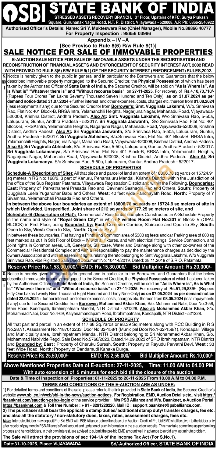 All that part and parcel in an extent of 117.68 Sq. Yards or 98.39 Sq.meters along with RCC Building in RS No.287/1, Assessment No. 1187013233, Door No.32-158/1 (Municipal Door No.1-32-158/1), Kondapalli Village and Municipality area, Ibrahimpatnam Mandal, NTR District belonging to Sri Mohammed Akbar Khan, S/o. Mohammad Nabi vide Regd. Sale Deed No.5768/2023, Dated. 14.09.2023 of SRO Ibrahimpatnam, NTR District and Bounded by: East: Property of Cheruku Suresh, South: Property of Rayudu Parvathi Devi, West: 33 feet Wide Road, North: Property of Dandamudi Kanaka Durga.