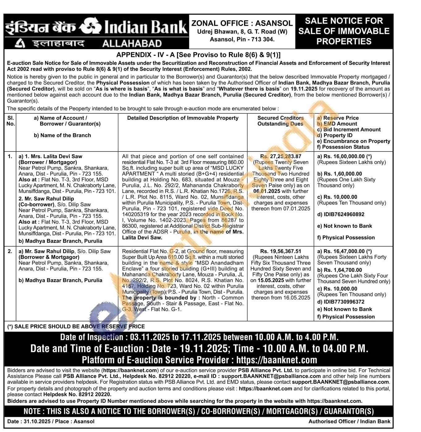 All that piece and portion of one self contained residential Flat No. T-3 at 3rd Floor measuring 860.00 Sq.ft. including super built up area of "MSD LUCKY APARTMENT" A multi storied (B+G+4) residential building at Holding No. 683, situated at Mouza -Purulia, J.L. No. 292/2, Mahananda Chakraborty Lane, recorded in R.S./L.R. Khatian No.1726, R.S. /L.R. Plot No. 8115, Ward No. 02, Munsiffdanga within Purulia Municipality, P.S. - Purulia Town, Dist-Purulia, Pin-723 101, registered vide Deed No. 140205319 for the year 2023 recorded in Book No. I, Volume No. 1402-2023, Pages from 86287 to 86300, registered at Additional District Sub-Registrar Office of the ADSR - Purulia, in the name of Mrs. Lalita Devi Saw.