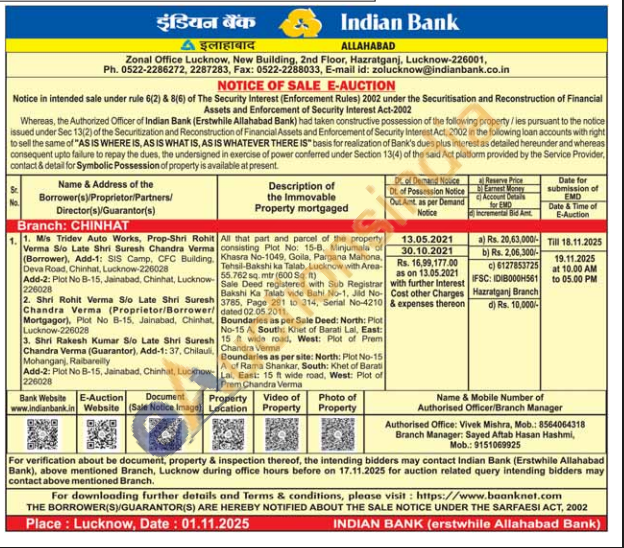 All that part and parcel of the property consisting Plot consisting Plot No. 15-8, Minjumala of Khasra No-1049, Goila, Pargana Mationa Tehsil-Bakshi ka Talab, Lucknow with Area 55.762 sq. mtr (600 Sq.ft) Sale Deed registered with Sub Registrar Elakahi Ka Talab vide Bahi No-1, Jild No-3785, Page 291 to 314, Serial No-4210 dated 02.05.2011. Boundaries as per Sale Deed: North: Pict No-15 A, South: Khet of Barati Lol, East: 15ft wide road, West: Plot of Prem Chandra Verma Boundaries as per site: North: Plot No-15 A of Rama Shankar, South: Khet of Barati Lal, East: 15 ft wide road, West: Plot of Prem Chandra Verma
