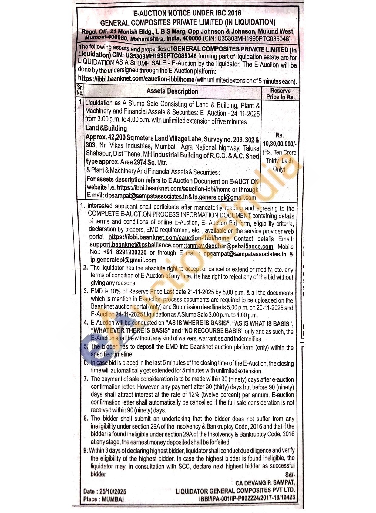 Liquidation as A Slump Sale Consisting of Land & Building, Plant & Machinery and Financial Assets & Securities: E Auction-24-11-2025 from 3.00 p.m. to 4.00 p.m. with unlimited extension of five minutes.