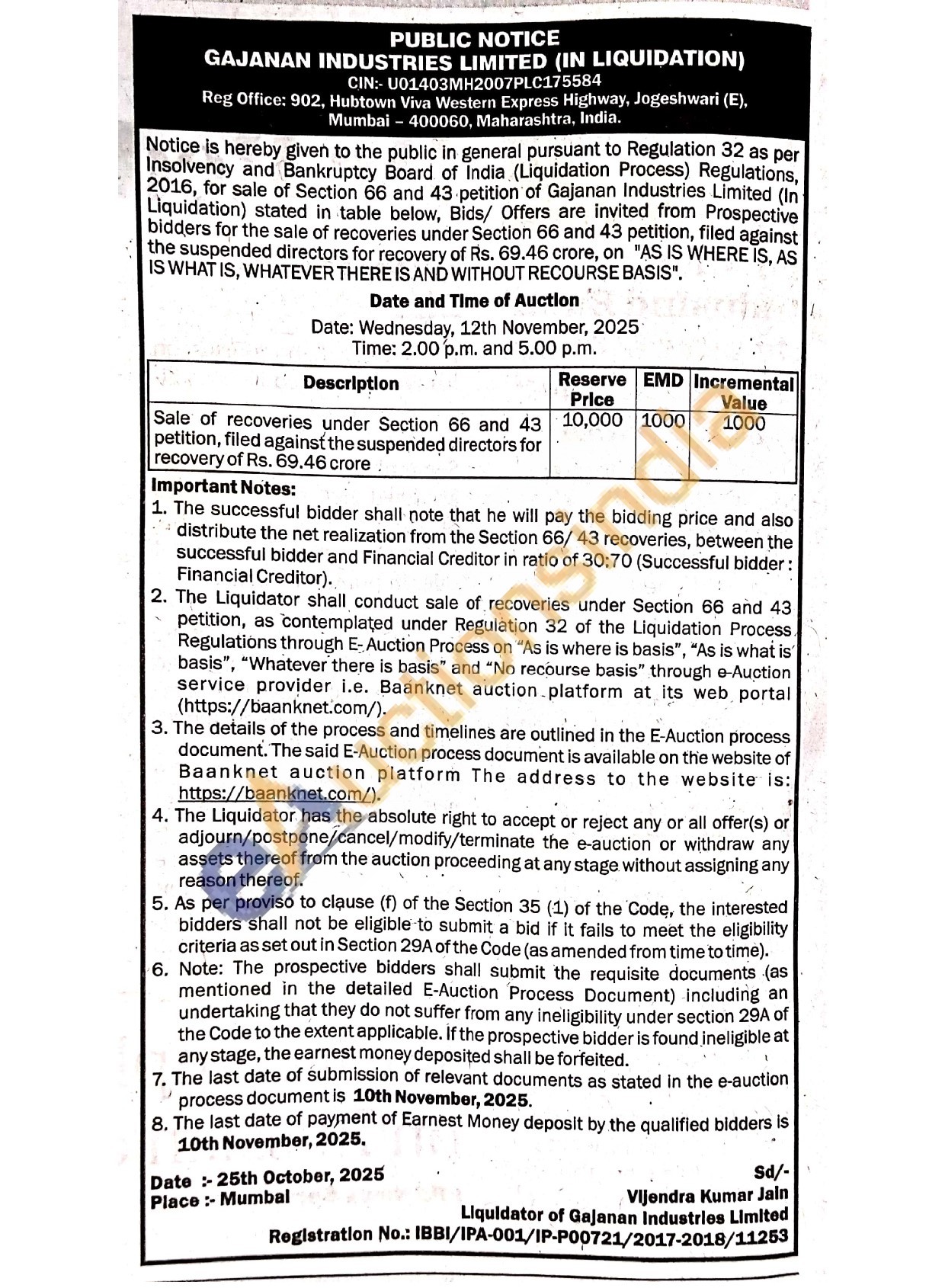 Sale of recoveries under Section 66 and 43 petition, filed against the suspended directors for recovery of Rs. 69.46 crore.