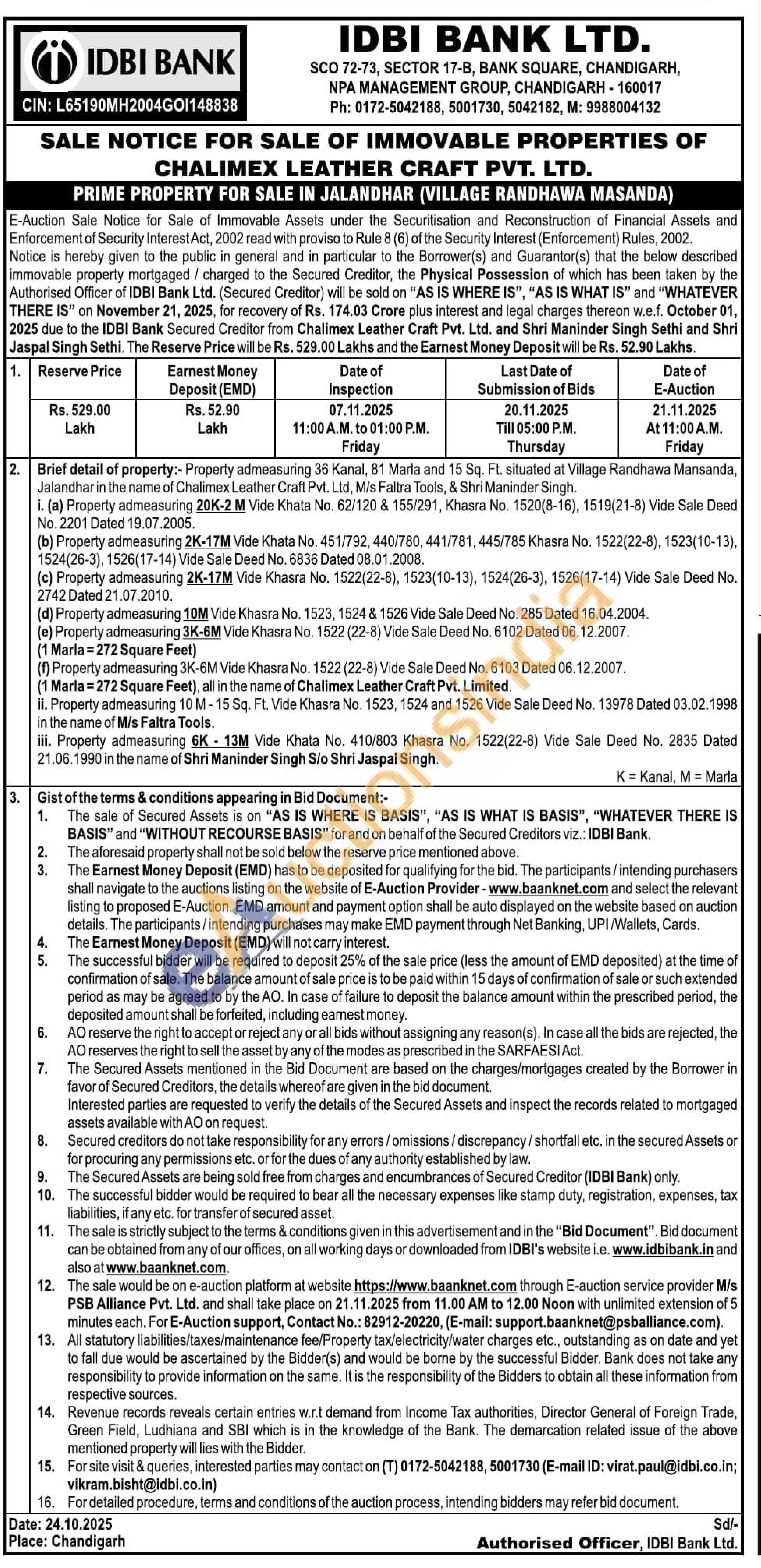 Brief detail of property:- Property admeasuring 36 Kanel, 81 Maria and 15 Sq. Fl. situated at Village Randhawa Mansanda, Jalandhar in the name of Chalimex Leather Craft Pvt. Ltd, M's Faltra Tools, & Shn Maninder Singh.