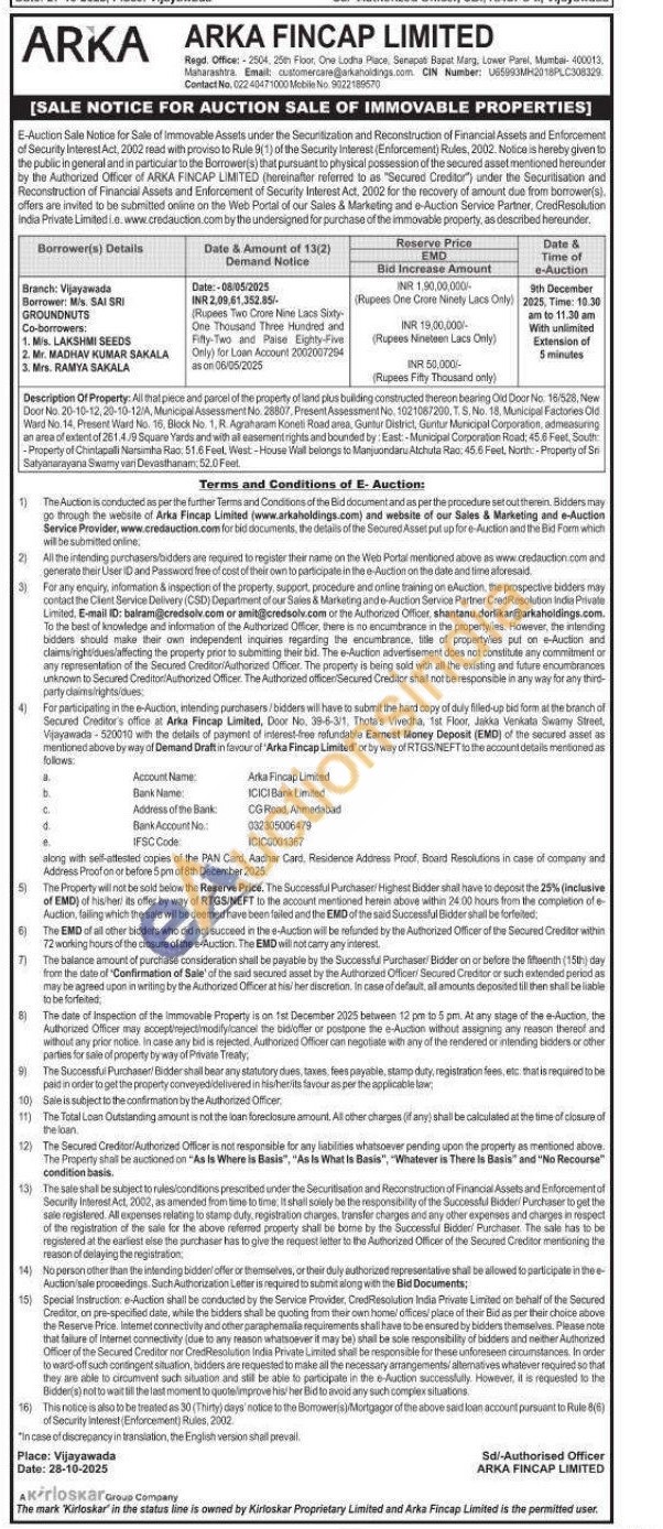 Description Of Property: All that piece and parcel of the property of land plus building constructed thereon bearing Old Door No. 16/528, New Door No. 20-10-12,20-10-12/A, Municipal Assessment No. 28807, Present Assessment No. 1021087200, T. S. No. 18. Municipal Factories Old Ward No. 14, Present Ward No. 16, Block No. 1, R. Agraharam Koneti Road area, Guntur District, Guntur Municipal Corporation, admeasuring an area of extent of 261.4/9 Square Yards and with att easement rights and bounded by: East:-Municipal Corporation Road: 45.6 Feet, South -Property of Chintapalli Narsimha Rao, 51.6 Feel, West-House Wall belongs to Manjuondaru Atchuta Rao: 45.6 Feel, North: -Property of Sn Satyanarayana Swamy vari Devasthanam: 52.0 Feet.