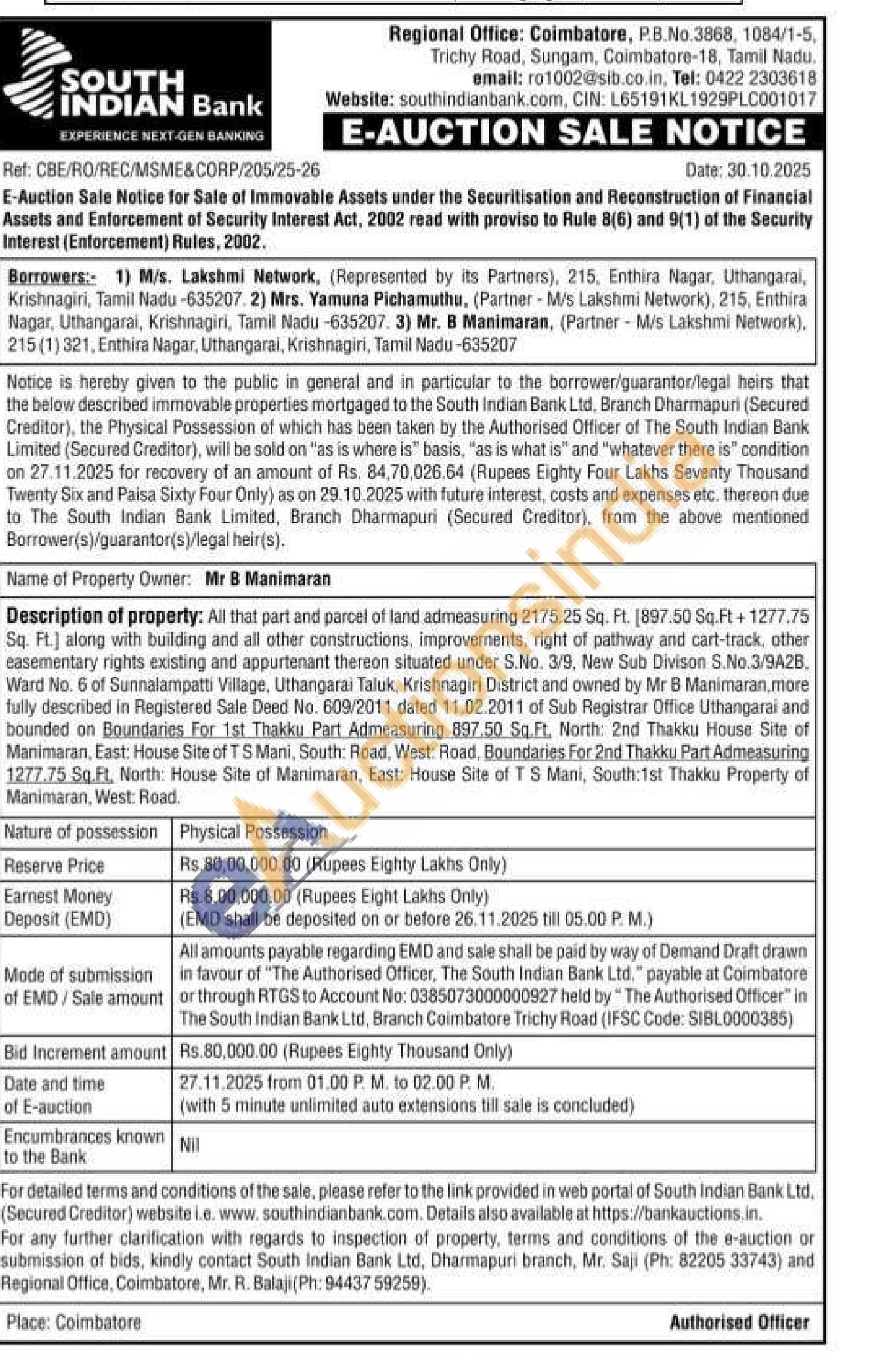 All that part and parcel of land admeasuring 2175.25 Sq. Ft. [897.50 Sq.Ft+1277.75 Sq. Ft.] along with building and all other constructions, improvements, right of pathway and cart-track, other easementary rights existing and appurtenant thereon situated under S.No. 3/9, New Sub Divison S.No.3/9A2B. Ward No. 6 of Sunnalampatti Village, Uthangarai Taluk, Krishnagiri District and owned by Mr B Manimaran, more fully described in Registered Sale Deed No. 609/2011 dated 11.02.2011 of Sub Registrar Office Uthangarai and bounded on Boundaries For 1st Thakku Part Admeasuring 897.50 Sq.Ft. North: 2nd Thakku House Site of Manimaran, East: House Site of TS Mani, South: Road, West: Road, Boundaries For 2nd Thakku Part Admeasuring 1277.75 Sq.Ft, North: House Site of Manimaran, East: House Site of T S Mani, South:1st Thakku Property of Manimaran, West: Road.