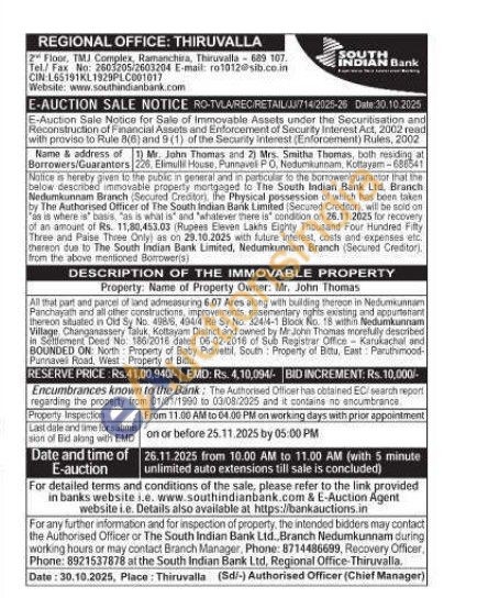 All that part and parcel of land admeasuring 6.07 Ares along with building thereon in Nedumkumnam Panchayath and all other constructions, improvements, sasementary nights existing and appurtenant theneon situated in Old Sy No. 498/6, 494/4 Re Sy No. 324/4-1 Block No. 18 within Nedumkunnam Village Changanassery Taluk, Kottayam Distinct and owned by Mr.John Thomas morefully described in Settlement Deed No. 186/2018 dated 06-02-2016 of Sub Registrar Office Karukachal and BOUNDED ON North Property of Baby Pidivettil, South Property of Bittu, East Paruthimood-Punnavell Road, West: Property of Bitu