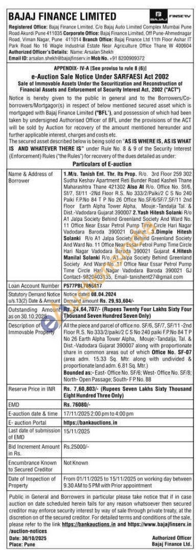 All the piece and parcel of office no. SF/6, SF/7, SF/11-2nd Floor R.S. No 333/2/paiki/2 C S No 240 paiko F.P.No 84 TP No 26 Earth Alpha Tower Alpha, Mouje Tandalja, Tal. & Dist. Vadodara Gujarat 390007 along with proportionate share in common areas out of which Office No. SF-07 (area adm. 15.33 Sq. Mtr along with undivided & proportionate land adm 6.81 Sq. Mtr.)