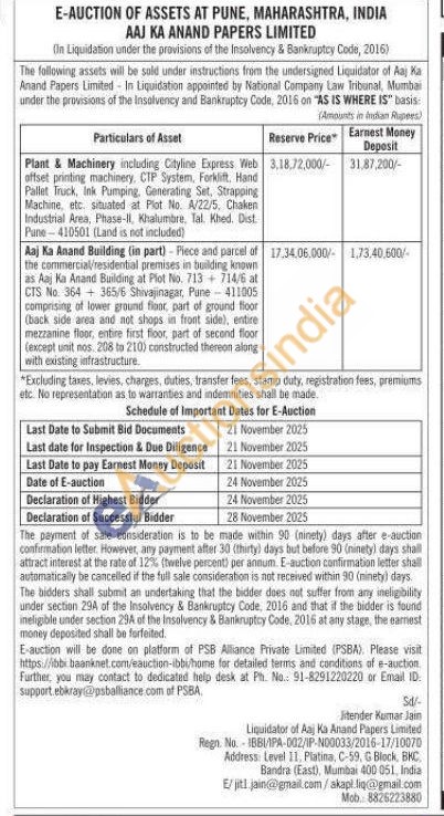 Plant & Machinery including Cityline Express Web offset printing machinery, CTP System, Forklift, Hand Pallet Truck, Ink Pumping, Generating Set, Strapping Machine, etc situated at Plot No. A/22/5, Chaken Industrial Area, Phase-II, Khalumbre. Tal. Khed. Dist Pune-410501 (Land is not included)
