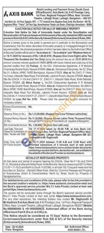 All that piece and parcel of property bearing No.234/3A, (New No.F-1/A) and 234/4 F-37, Situated at Uttaradhi Mata Road, Khille Mohalla Mysore measuring EAST to West (10.05-11.43)/2 and North to South 14.62 Mts, in all total 155.13 square meter and the bounded on: East by: Uttaradhi Mata Road, West by: Common Passage and Property of Subramanya Jhoshi & Chandrashekar, North by Road, South by, Property of Vanajakshamma.