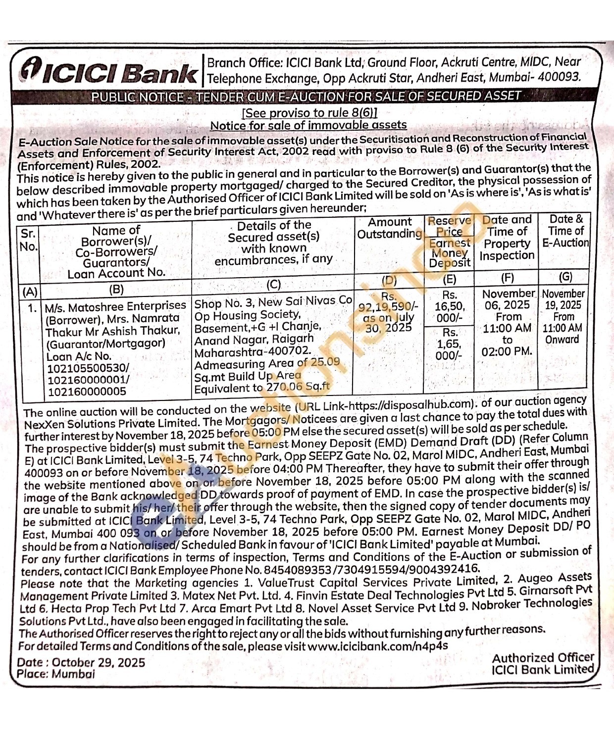 Shop No. 3, New Sai Nivas Co Op Housing Society, Basement,+G +1 Chanje Anand Nagar, Raigarh Maharashtra-400702. Admeasuring Area of 25.09 Sq.mt Build Up Area Equivalent to 270.06 Sq.ft