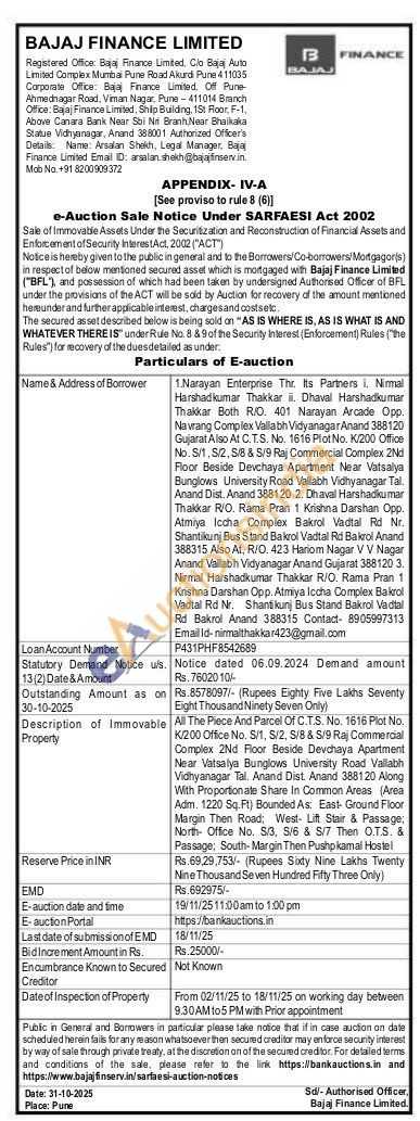 All The Piece And Parcel Of C.T.S. No. 1616 Plot No. K/200 Office No. S/1, S/2, S/8 & S/9 Raj Commercial Complex 2Nd Floor Beside Devchaya Apartment Near Vatsalya Bunglows University Road Vallabh Vidhyanagar Tal, Anand Dist. Anand 388120 Along With Proportionate Share In Common Areas (Area) Adm. 1220 Sq. Ft) Bounded As: East- Ground Floor Margin Then Road, West Lift Stair & Passage, North Office No. S/3, S/6 & S/7 Then O.T.S, & Passage: South-Margin Then Pushpkamal Hostel