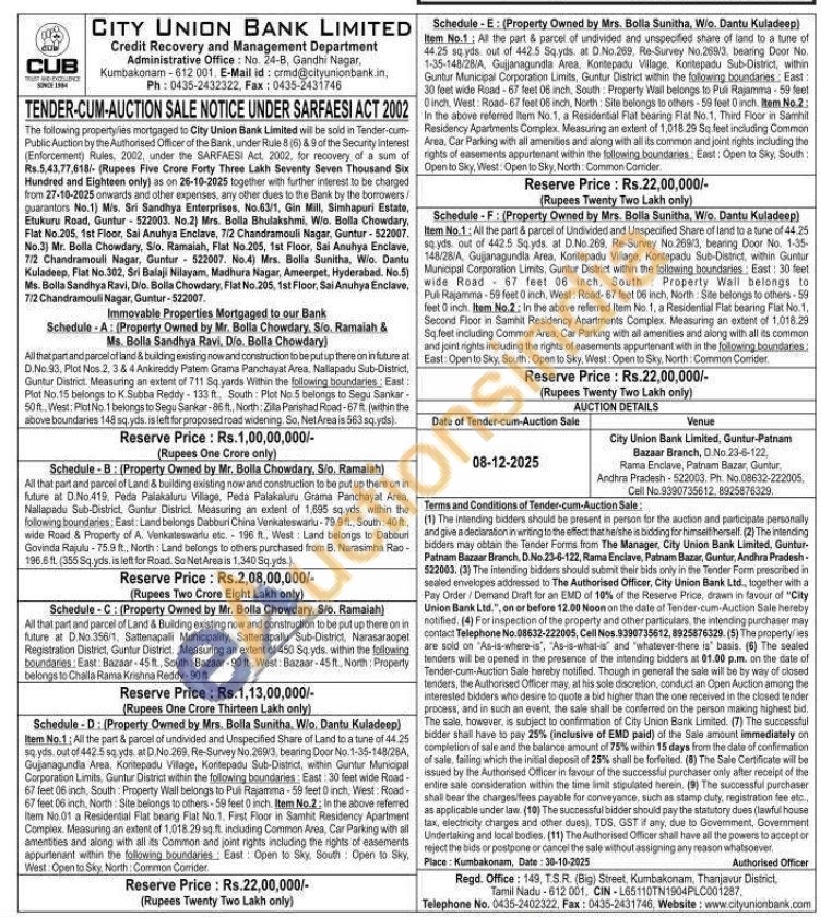 All that part and parcel of land & building existing now and construction to be put up there on in future at D.No.93, Plot Nos 2, 3 & 4 Ankireddy Patem Grama Panchayat Area, Nallapadu Sub-District, Guntur District. Measuring an extent of 711 Sq yards Within the following boundaries: East Plot No.15 belongs to K. Subba Reddy-133 ft, South Plot No 5 belongs to Segu Sankar-50ft, West: Plot No 1 belongs to Segu Sankar-86 ft., North: Zilla Parishad Road-67 ft. (within the above boundaries 148 sq.yds. is left for proposed road widening. So, Net Area is 563 sq yds)