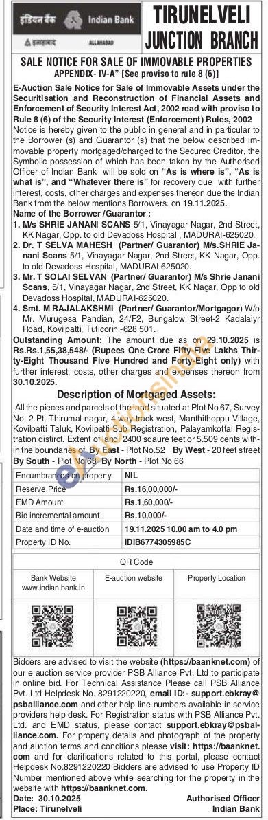 All the pieces and parcels of the land situated at Plot No 67, Survey No. 2 Pt, Thirumal nagar, 4 way track west, Manthithoppu Village, Kovilpatti Taluk, Kovilpatti Sub Registration, Palayamkottal Regis tration distirct. Extent of land: 2400 sqaure feet or 5.509 cents with-in the boundaries of By East-Plot No.52 By West-20 feet street By South Plot No 68 By North - Plot No 66