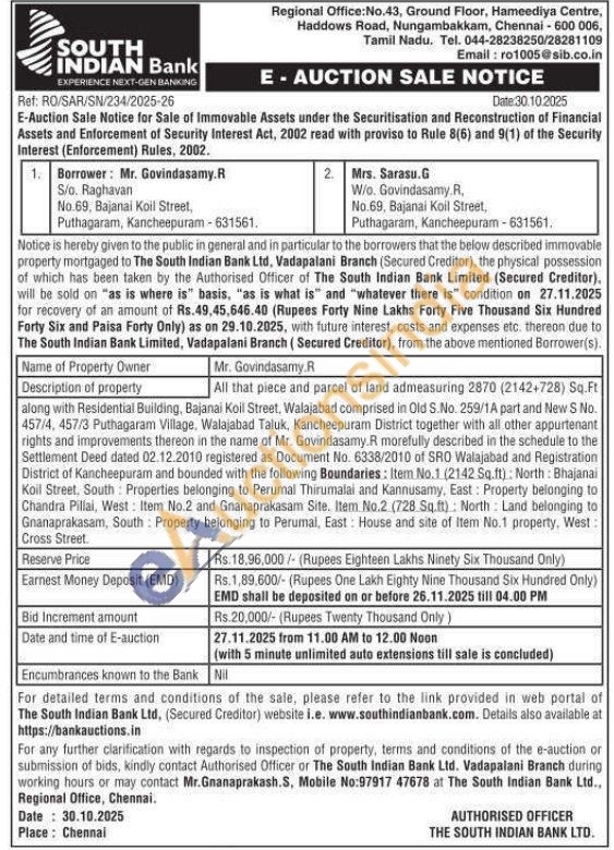 All that part and parcel of Plot No.2 admeasuring 5.40 Cents along with building and all other constructions, improvements, right of pathway and cart-track, other easementary rights existing and appurtenant thereon situated at Thiruvalluvar Nagar, Sivagiripatti under S.F.No.144/2, New S.F.No.144/2A7 of Sivagiripatti Village, Palani Taluk, Dindigul District and owned by Mr Krishna Chandar, more fully described in Registered Settlement Deed No.412/BK1/2006 dated 14.03.2006 of Joint Sub Registrar Office Palani and Bounded on: North: Plot No.3, East: 20 Feet Wide North-South Road, South: Land of Karthikeyan in Plot No 1, West: Land in Survey No.144/2A.