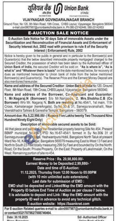 All that piece and parcel of of the Residential property bearing Site No.454, Present BBMP municipal No.454/1 PID No.16-67-454/1 formed in Sy No.308 31 of Sanneguruvanahalli Village, Yeshwantpura Hobli, Bangalore North Taluk at present Ward No-16, Kamalanagar, Bangalore 560079 measuring East to West 13 Feet and North to South 23 Feet totally measuring 299 Sq Feet and bounded by On the North: Road, On the South: Private Property, On the East. Property of Lakshmalah, On the West: Remaining portion of site no 454,
