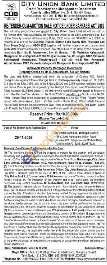 The Land and Building situated well within the Jurisdiction of Dindigul R.D. Joint-il, Dindigul Sub-Registrar Office of Dindigul Taluk in Chettinayakkenpatty Village in S.No.238/1, 2,3 also in the S.No. 235/3, also in the S Nos 232/1A2 and 239/1 together had been divided into House Plots as per the approval by the Dindigul Panchayat Union Commissioner by R.Dis. Number: 6632/1993 Dated 11-02-1994 by the name of Mayavan Nagar, D Section in which the Plot No.20A, situated in the S.No.235/3 is bounded by: South Plot No.20. North House Plots in the possession of Gunasekaran in S.No.235, West-Vacant Portion vested with Gunasekaran, East 23 feet North South Road, Within which the said House Plot is having the measurement of East-West on both sides with 60 feet, North-South with 40 feet to the Total of 2,400 Sq. ft., of House Plot along with all pathway rights