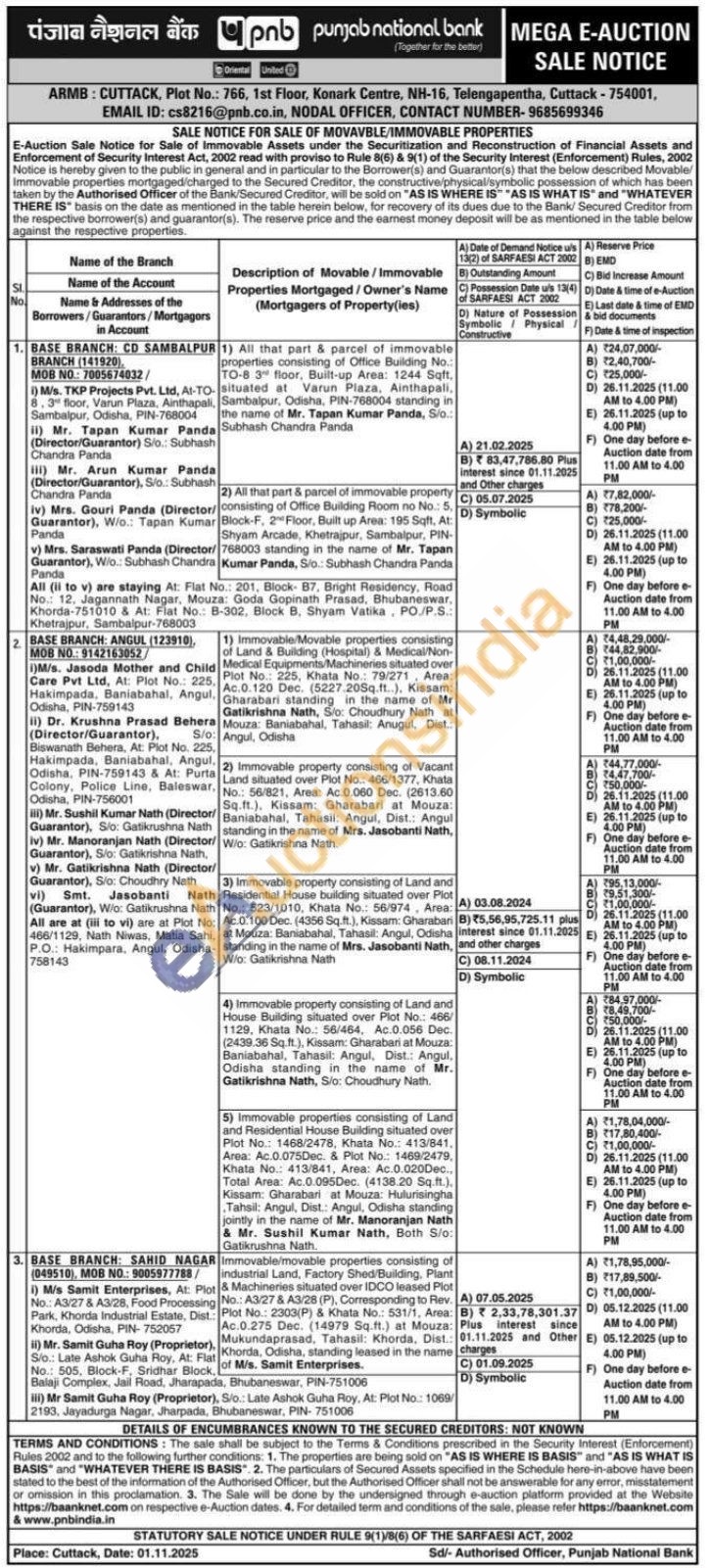 1) Immovable/Movable properties consisting of Land & Building (Hospital) & Medical/Non-Medical Equipments/Machineries situated over Plot No.: 225, Khata No.: 79/271, Area: Ac.0.120 Dec. (5227.20Sq.ft..). Kissam: Gharabari standing in the name of Mr Gatikrishna Nath, S/o: Choudhury Nath at Mouza: Baniabahal, Tahasil: Anugul, Dist. Angul, Odisha