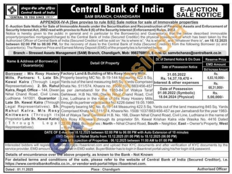 Factory Land & Building of Mis Rosy Hosiery Mills. Late Sh. Property bearing MC No. B-19-144 Measuring 422.5 Sq. Sh. Rahul Khata No. 511/574, Khasra no. 1508/1037/883/456-457 Office-144, Diwan as per Jamabandi for the 1983-84 of Wakya Taraf Civil Lines, Gehlewal, H.B No.166, Diwan Nihal Chand Road, Civil Guarantor: Line, Ludhiana in the name of Mis Rosy Hosiery Mills (Through through its partner vide Wasika No.4226 dated 19.05.1989, Representatives). Sh. Property bearing MC No. B-19-144 Measuring 422.5 Sq. Yards out of the land measuring 845 Sq. Yards M/s Rosy Comprised Khata No. 511/574, Khasra No. 1508/1037/883/456-457 as per Jamabandi for the year 1983-Through its 84 of Wakya Taraf Gehlewal H.B. No. 166, Diwan Nihal Chand Road, Civil Line, Ludhiana in the name of Kewal Kalra) M/s Rosy Knitwears through its proprietor Sh. Kewal Krishan Kalra vide Wasika No. 4416 Dated Legal 22.05.1989. Boundaries: North-Nihal Chand Road, South-Neighbor, East-Owner's