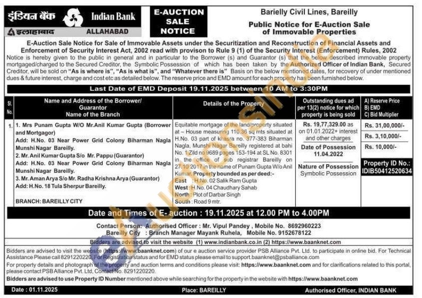 Equitable mortgage of the land/property situated at-House measuring 110.36 sq mts situated at H.No. 03 part of khasra no. 377-383 Biharman Nagla, Munshi Nagar Bareilly registered at bahi No. 1 Zild no 9689 pages 153-194 at SL No. 8301 in the office of sub registrar Bareilly on 27.10.2017 in the name of Punam Gupta Wio Anil