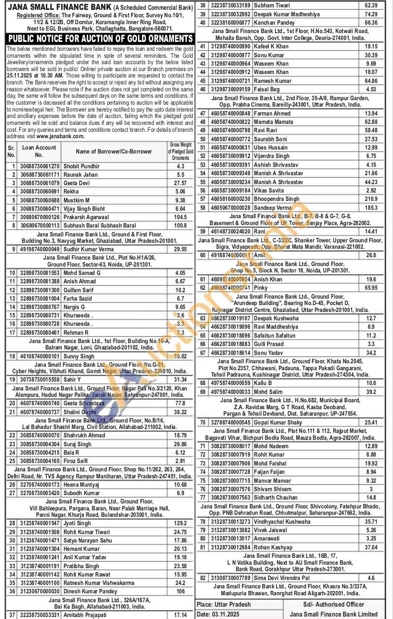 Jana Small Finance Bank Gold Auctions Auction in Noida