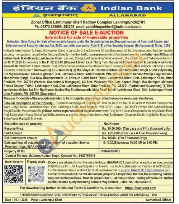Equitable mortgage of Property at Gata no 400 Plot No 06 situated at Mohalla Samapuram Ward-Anya Tehsil-Lakhimpur Kheri, Dist-Lakhimpur Kheni, Uttar Pradesh, PIN-262701 Area-1200 Sq. Ft. Owner-Shn Akhand Pratap Singh Sio Shri Muneshwar Singh Boundaries as per sale deed are as under: North: Araji Smt Kusum Chauhan South: Araji Seller East Araji Seller West: Rasta 20 fit of width Boundaries as per site are as under: North: Araji Smt Kusum Chauhan South: Araji Seller East: Ara Seller West: Rasta 20 fit of width