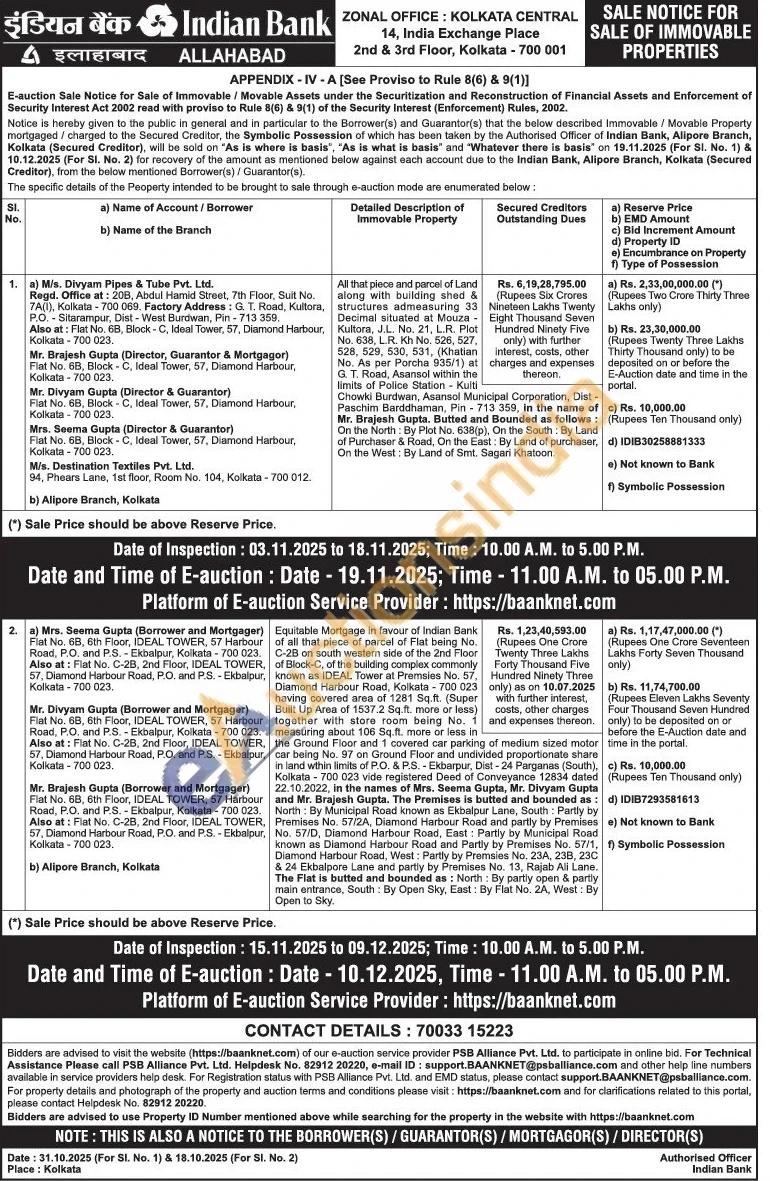 Equitable Mortgage in favour of Indian Bank of all that piece of parcel of Flat being No. C-28 on south western side of the 2nd Floor of Block-C, of the building complex commonly known as IDEAL Tower at Premsies No. 57, Diamond Harbour Road, Kolkata-700 023 having covered area of 1281 Sq.ft. (Super Built Up Area of 1537.2 Sq.ft. more or less) together with store room being No. 1 measuring about 106 Sq. ft. more or less in the Ground Floor and 1 covered car parking of medium sized motor car being No. 97 on Ground Floor and undivided proportionate share in land within limits of P.O. & P.S.-Ekberpur, Dist-24 Parganas (South), Kolkata-700 023 vide vide registered Deed of Conveyance Deed of Conveyance 12834 dated 22.10.2022, in the names of Mrs. Seema Gupta, Mr. Divyam Gupta and Mr. Brajesh Gupta. The Premises is butted and bounded as: North: By Municipal Road known as Ekbalpur Lane, South: Partly by Premises No. 57/2A, Diamond Harbour Road and partly by Premises No. 57/D, Diamond Harbour Road, East: Partly by Municipal Road known as Diamond Harbour Road and Partly by Premises No. 57/1, Diamond Harbour Road, West: Partly by Premsies No. 23A, 238, 23C & 24 Ekbaipore Lane and partly by Premises No. 13, Rajab All Lane. The Flat is butted and bounded as: North: By partly open & partly main entrance, South: By Open Sky, East: By Flat No. 2A, West: By Open to Sky.