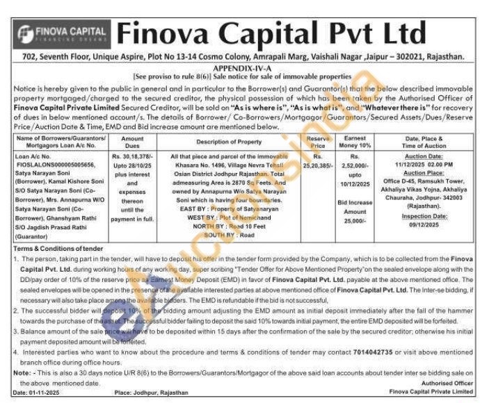All that piece and parcel of the immovable Khasara No. 1496, Village Nevra Tehsil Osian District Jodhpur Rajasthan. Total admeasuring Area is 2879 Sq Feets. And owned by Annapurna Wio Satya Narayan Soni which is having four boundaries. EAST BY: Property of Satyanaryan WEST BY: Plot of Nemichand NORTH BY: Road 10 Feel SOUTH BY: Road