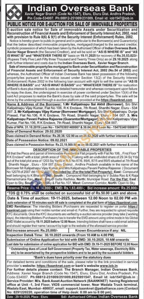 All that the Piece and parcel of Immovable Residential Flat property with Flat No 106,, First Floor RK Enclave" with a total, plinth area of 1000 Sq Ftalong with an undivided share of 29.34 Sq Yds out of the total plot area of 1203 Sq Yards in RS No 87/6, 89/6, 87/5 and 89/5 situated at 7th Road Shanthi Nagar, Eluru-534 007 Eluru District, Andhra Pradesh available in the name of the Borrower Mr Kalipatnapu Vijay Kumar and Mrs Kalipatnapu Pavani Padma Rajasree (Document No 12078 of 2007 dtd 19.12.2007) Bounded by: (For the total Plot Property): East: Compound wall belonging to K Bharathi Devi, South: Compound Wall belonging to V Subba Rao & K Raja Ramamohana Rao, West: Site of Gutta Radhika, North: Municipal Road. For the Flat: East: Open to Sky, South: Open to Sky & Flat No. 107, West: Common Corridor, North: Open to Sky.