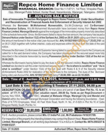 All that piece arid parsel of an Open Plot No. 15, to an extent of 171.11 Sq. Yards as per valuation report, 200.00 Sq. Yards as per Regd. Document i Survey Nas 155/A, 1560, and 158/C situated at Matwada Village, Warangal City and Mandal and District within the Greater Warangal Municipal Corporation and having the following boundaries: East Puls of NT.PO Employees, West: 40 Feel Wide Road